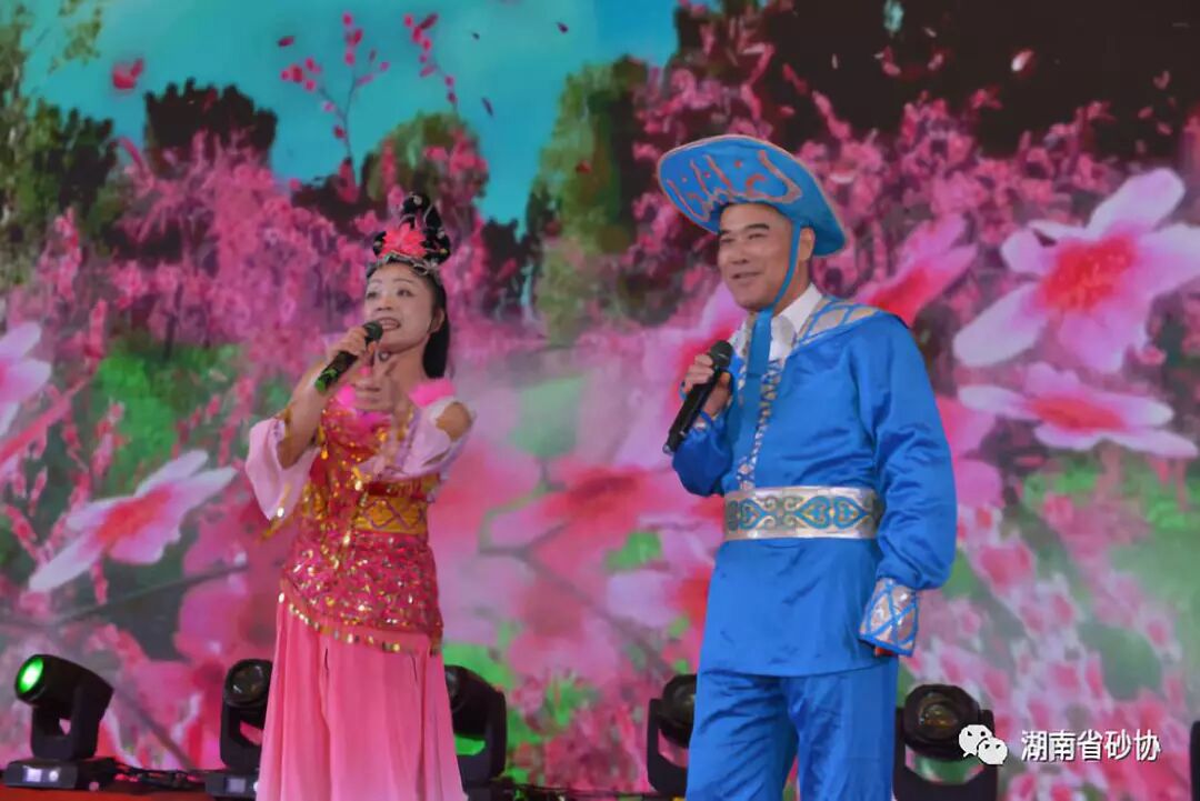 晚会第二项节目是由湖南省砂石协会会长李建科、宸浚能源科技有限公司刘桂香带来情歌对唱《刘海砍樵》