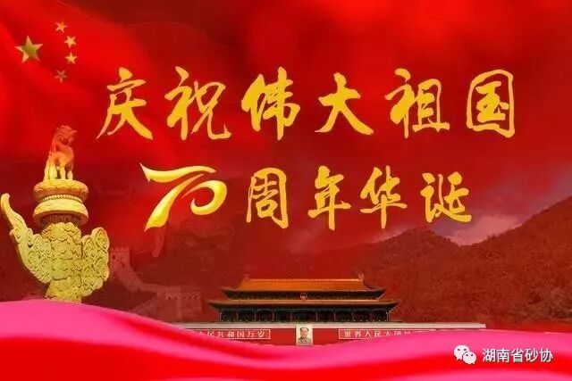 金秋是收获的季节,在这美好的金秋时节,我们伟大的祖国母亲迎来了七十岁生日,七十年的风雨征程,带来了祖国繁荣强大,如同阳光照亮了我们的前程,七十年的艰苦奋斗,七十年的拼搏创新,造就了七十年后繁荣昌盛的中国,《歌唱祖国》今天我们湖南省砂石协会以自豪伴随您的喜悦,明天我们将以奋发图强奏响您的复兴凯歌!