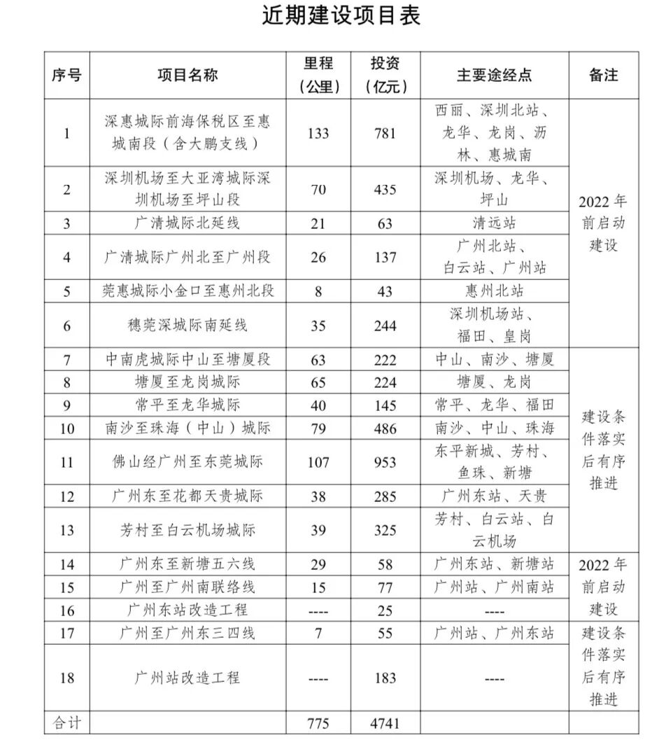 规划建设13个城际铁路和5个枢纽工程项目,总里程约775公里,形成主轴强化、区域覆盖、枢纽衔接的城际铁路网络。其中,2022年前启动深圳机场至大亚湾城际深圳机场至坪山段、广清城际北延线等6个城际铁路项目和广州东站改造工程等3个枢纽工程建设,规划建设里程337公里;待相关建设条件落实后,有序推进塘厦至龙岗、常平至龙华等7个城际铁路项目和广州站改造工程等2个枢纽工程实施,规划建设里程438公里。