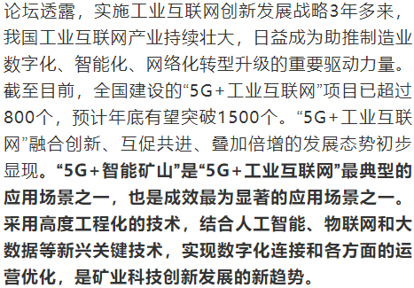 | 全国“5G+工业互联网”项目超800个 “5G+智能矿山”是成效最为显著的 应用场景之一 |