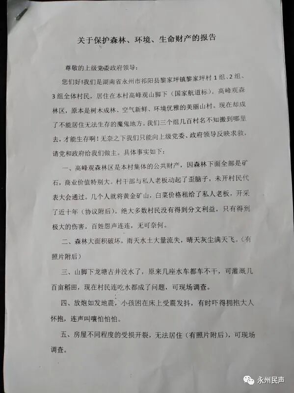 近十年来,村民长期生活在扬尘中,遇暴雨天气极易发生泥石流等灾害,大部分房屋因受震动开裂、水源断流,民愤极大。全村村民强烈要求停止开采,还梨家坪村绿水青山,期待各级老爷高度重视监管落实。为此,黎家坪村村民联名出具停止对黎家坪采石场开采的报告。