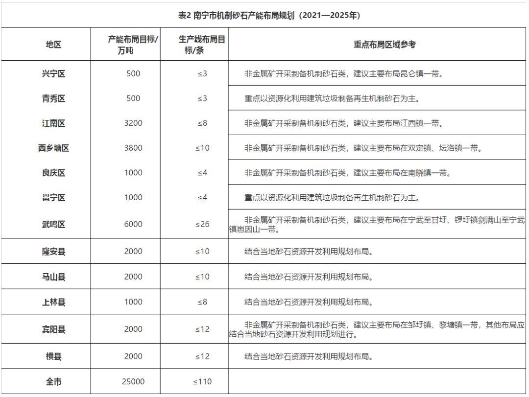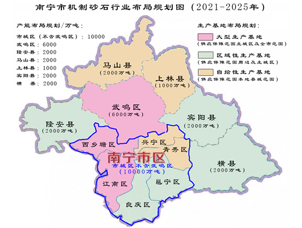 近日,广西南宁市人民政府发布《南宁市人民政府办公室关于印发南宁市机制砂石行业布局规划(2021—2025年)的通知》,对南宁市机制砂行业2021-2025年内的总体、各县区、产能规模做出布局规划。