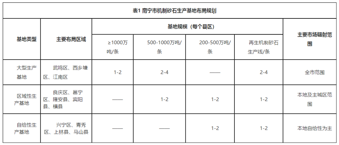 大型生产基地主要布局在武鸣区、西乡塘区、江南区。布局规划:每个区分别布局建设1—2条年产能达到1000万吨及以上的机制砂石生产线,布局建设2—4条年产500至1000万吨的机制砂石生产线,布局建设2—4条再生机制砂石生产线。