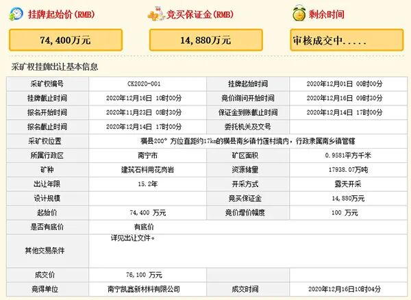 日前,南宁凯鑫新材料有限公司以7.61亿元的价格,成功拍下CK2020-001采矿权(广西横县石龙麓矿区建筑用花岗岩矿区)。目前,该交易结果正在审核中。