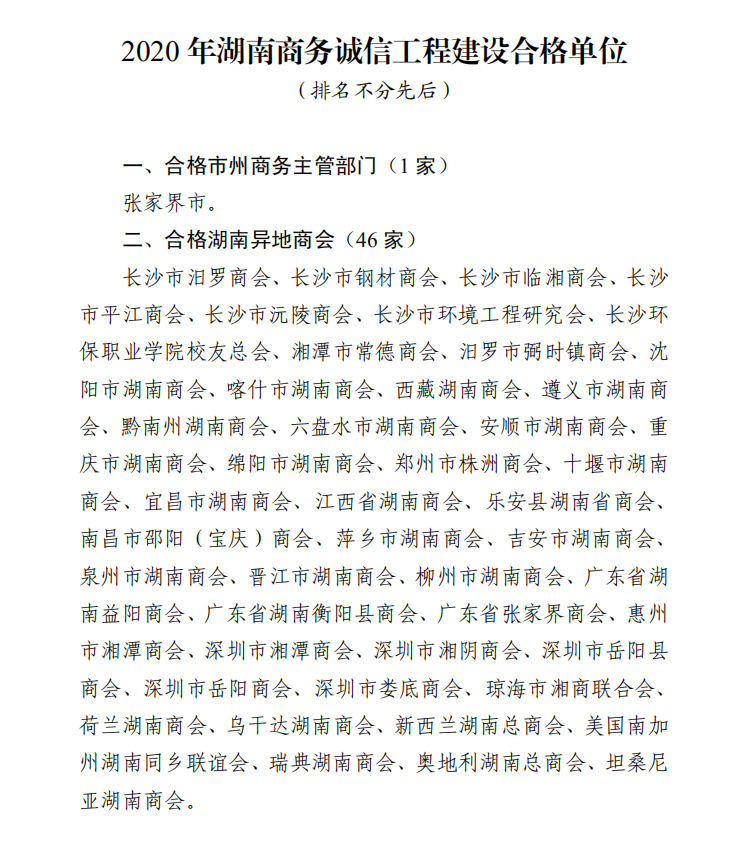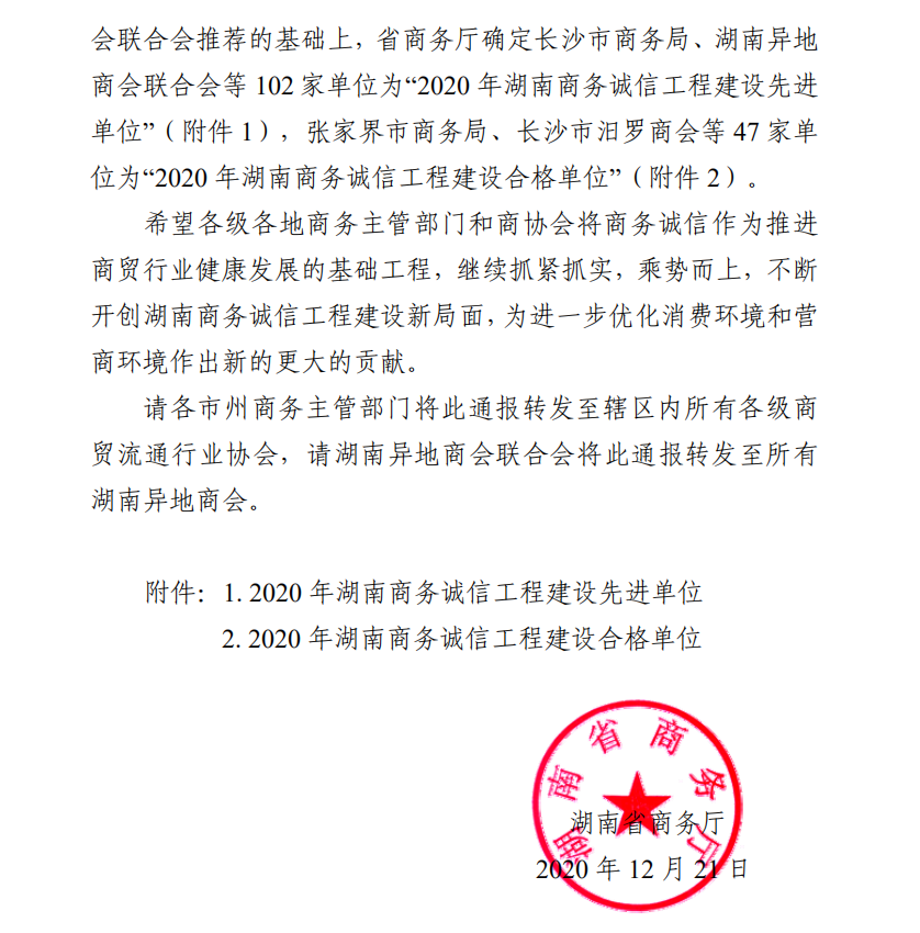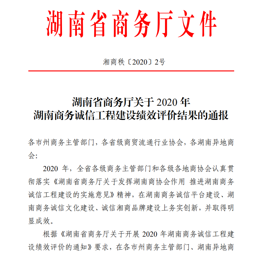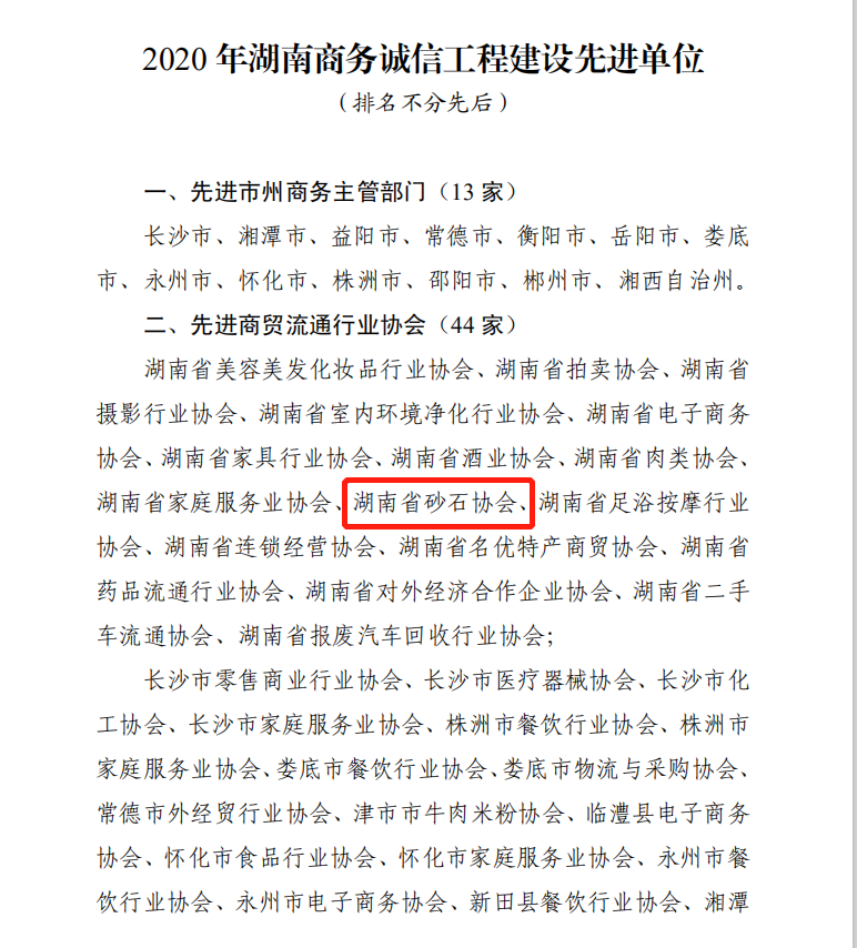 【荣誉】恭喜我会荣获“2020年湖南商务诚信工程建设先进单位”称号​ 发布日期:2020-12-23 04:08:11 点击量:1 标签:商务诚信 今日,湖南省商务厅正式发文公布湖南省砂石协会跻身“2020 年湖南商务诚信工程建设先进单位”!这既是国家社会对砂石行业和湖湘砂石人厚爱所系,也意味着我们全行业从此倍感荣幸地进入诚信自律的新阶段。筑商务诚信标杆,创新引领行业发展。就砂石行业而言,把绿色矿山建设结合到诚信建设中来;把砂石骨料质量纳入到诚信体系中来;针对砂石企业,制定信用等级评价管理办法将是我们今后的工作方向。文 字:雷闪闪 图 片:欧阳琼 责任编辑:李欣桐声明:对转载、观点、图频保持中立,目的仅在于传递信息,版权归原作者,如遇侵权,我们将及时删除,谢谢。