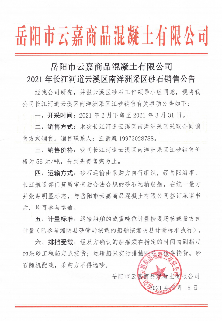 长江河道云溪区南洋洲采区江砂:56元/吨,先到先得,售完为止! 发布日期:2021-02-25 07:38:34 点击量:1 标签:行业新闻 近日,岳阳市云嘉商品混凝土有限公司发布2021年长江河道云溪区南洋洲采区砂石销售公告,采区开采时间为2021年2月下旬至3月31日,江砂销售价格为56元/吨,先到先得,售完为止。公告详情如下:文 字:雷闪闪 图 片:欧阳琼 责任编辑:李欣桐声明:对转载、观点、图频保持中立,目的仅在于传递信息,版权归原作者,如遇侵权,我们将及时删除,谢谢。