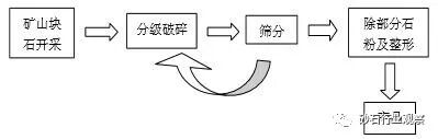 一般矿山开采得到的母岩经颚式破碎机粗碎、再经反击式破碎机中碎、最终经冲击式破碎机细碎制砂,筛分大于4.75mm的岩石颗粒返回破碎,小于4.75mm的砂石颗粒再根据当地条件选用干法或湿法的除粉工艺调整石粉含量,最终得到产品。