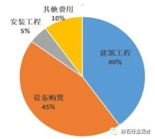图2为某机制砂企业项目建设阶段的各方面资金投入占总投入的占比。如图2所示,设备购置费为该机制砂项目最大的投入,占比约45%;投资额第二大的为建筑工程,占比约40%(含土地征用);其他费用含土地征用租用(矿山边的多为租用)、基本预备费及相关费用等。可见设备购置费用和建筑工程的花费控制是项目建设阶段投入控制的要点。