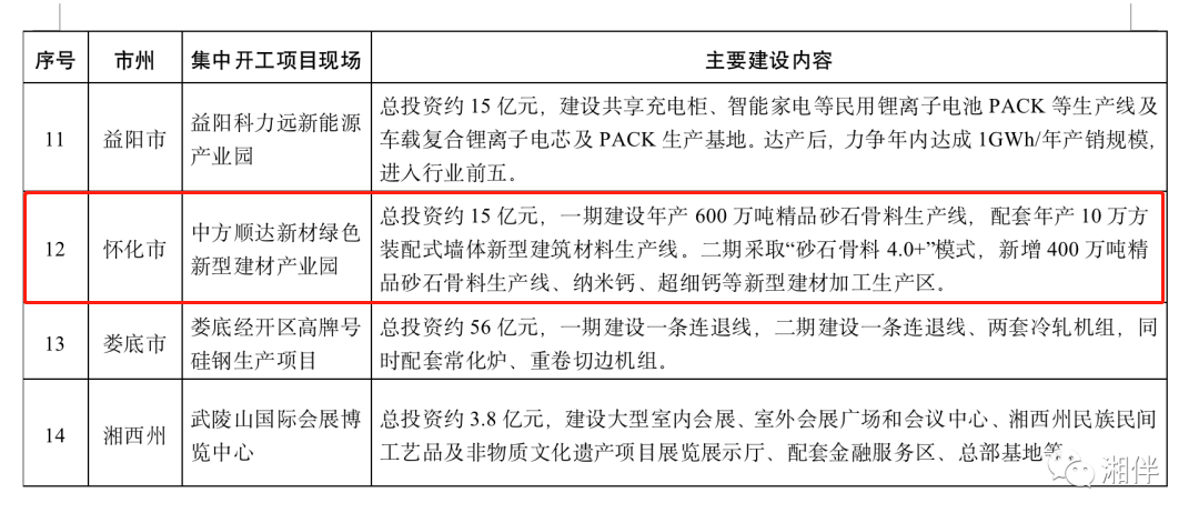 在这批开工的项目中,小编关注到:怀化市中方顺达新材绿色新型建材产业园总投资约15亿元,一期建设年产600万吨精品砂石骨料生产线,配套年产10万方裴配式墙体新型建筑材料生产线,二期采取“砂石骨料4.0+“模式,新增400万吨精品砂石骨料生产线、纳米钙、超细钙等新型建材加工生产区。(附:市州集中开工现场项目情况表)这些项目中,投资10亿元以上的项目有140个,占总数的11.3%,其中,10至50亿元110个、50至100亿元21个、过百亿的9个。数量之多,投资之大,令人咂舌。那么,这些项目都是什么来头?从领域看,本次集中开工重大项目中,交通、能源、水利、新基建等基础设施项目有192个、年度投资达到682亿元,分别占项目总数和年度投资总量的15%、25%;先进制造业、科技创新、现代物流和现代农业、自贸区建设等产业发展项目848个、年度投资1540亿元,分别占项目总数和年度投资总量的68%、57%;养老育幼、医疗教育、老旧小区改造和保障性住房等社会民生项目164个、年度投资273亿元,分别占项目总数和年度投资总量的13%、10%;长江经济带生态保护修复、洞庭湖水环境治理等生态环保项目44个、年度投资235亿元,分别占项目总数和年投资总量的4%、8%。从结构看,既有政府主导的基础设施项目,也有社会资本投资的产业项目;既有本土实力企业投资项目,也有国内外龙头企业投资项目,特别是社会投资占比达到80%,发挥了民间投资主力军作用。总体上来看,本次集中开工项目领域广、影响大、带动强,势必将为我省优化结构、转换动力创造的新优势。这次集中开工的1248个重大项目,涉及产业和基础设施等领域,都是强基础、增动能、利长远的项目。这批项目的集中开工,既是打好“三高四新”战略的首场战役,也是抢抓“十四五”规划开局的重要抓手,可谓影响重大,意义深远。毛伟明在发言中用12个字总结——精心组织、科学统筹、狠抓落实。要强化组织调度,抢抓有利时机、明确时间节点、加强协调联动、实行挂图作战、科学组织施工,力争项目早建成、早运营、早见效。要强化服务保障,加强土地、资金、用工、用能等要素保障,跟踪解决行政审批、施工环境等方面问题,确保项目建设有序推进,形成更多实物量。要强化质量安全,绷紧安全生产和疫情防控这根弦,严格落实属地责任、主体责任和监管责任,打造精品工程、平安工程、阳光工程、廉洁工程。战鼓催征马蹄疾,扬帆奋进正当时。美好蓝图只有落细落实,才能变成美好现实。我们要大力弘扬孺子牛、拓荒牛、老黄牛精神,以昂扬姿态奋力实现项目建设“开门红”,推动全省发展精彩开局,以优异成绩庆祝建党100周年!声明:对转载、观点、图频保持中立,目的仅在于传递信息,版权归原作者,如遇侵权,我们将及时删除,谢谢。