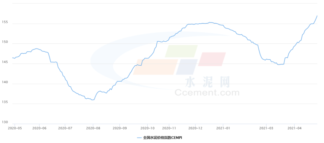 在需求驱动和煤价不断上涨等因素影响下,近期全国水泥价格指数(CEMPI)一路上升,截至4月27日,报收157点,环比上涨0.49%,同比上涨7.22%。近期,长三角水泥市场需求持续火爆,大企业门口经常出现排队拉货的现象。部分地区水泥价格一个月连涨5次,涨幅高达110-125元/吨。具体来看: