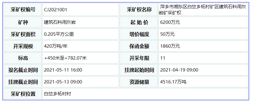 此外,根据《自然资源部关于推进矿产资源管理改革若干事项的意见》(自然资规[2019]7号)、《江西省自然资源厅关于贯彻自然资源部推进矿产资源管理改革若干事项意见的通知》(赣自然资规[2020]3号)文件精神,新设采矿权需进行“净矿”出让。前期政策处置费人民币5203.52万元由采矿权竞得人在签订《矿业权成交确认书》后5个工作日内全部缴清。此矿权位于江西省萍乡市上栗县福田镇双源村,矿区面积约0.3146平方千米,可采资源储量4642.08万吨,年生产规模360万吨/年,开采年限13.9年,起拍价23210.4万元,最终被南昌市润鼎置业有限公司以33510.4万元拍下,拍得资源单价7.2元/吨。据企查查显示,南昌市润鼎置业有限公司成立于2020年4月9日,法定代表人万园根,注册资本1000万元人民币,位于江西省南昌市南昌高新技术产业开发区紫阳大道紫鑫商务广场1号楼,万阳持股80%担任,万蓝持股20%。 据矿权出让须知显示,政策处置费人民币23166.71万元由采矿权竞得人在签订《矿业权成交确认书》后10个工作日内全部缴清,凡参与本挂牌项目的竞买申请人,视为对《上栗县福田镇双源建筑石料用灰岩矿采矿权挂牌出让实施方案》所有条款无异议,并对可能存在的风险完全接受。值得一提的是,相较浙江先前高达45元/吨拍得资源单价,此次江西的两宗砂石矿采矿权拍得资源单价都没有超过10元/吨,相对而言还是更显理性!声明:对转载、观点、图频保持中立,目的仅在于传递信息,版权归原作者,如遇侵权,我们将及时删除,谢谢。