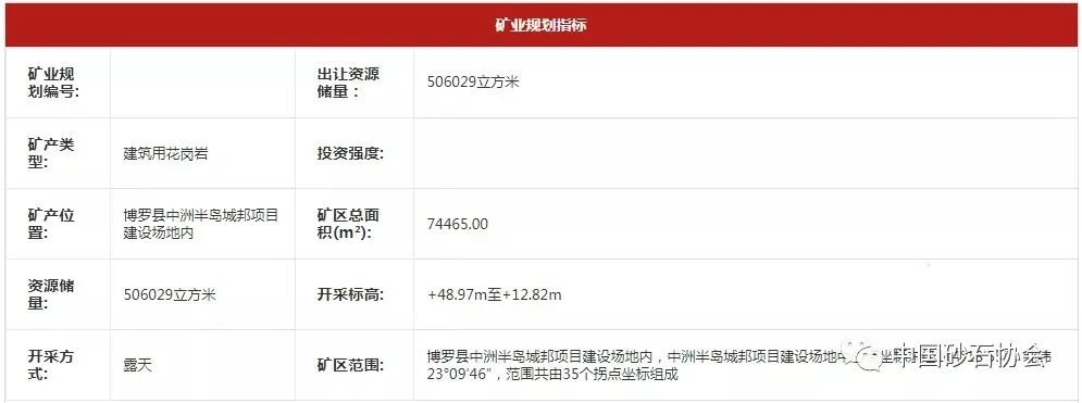 据惠州市公共资源交易中心成交信息显示:5月14日,由博罗县自然资源局委托该中心挂牌的一宗编号为BLKCXS202101号,储量506029立方米的建筑用花岗岩矿完成前期公示顺利成交,中航建筑工程有限公司以615万元底价竞得位于中洲半岛城邦项目建设场地内的该矿山开采权,平均竞得资源单价12.2元/立方米。
