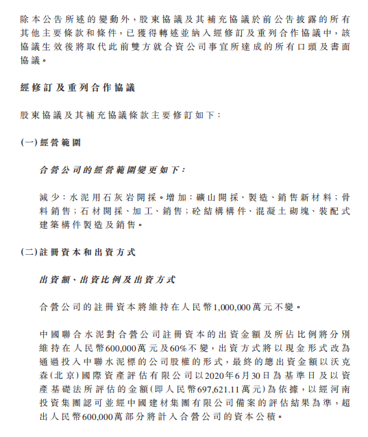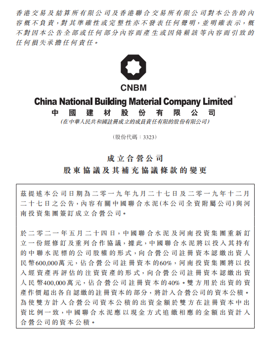 日前,中国建材上市公司发布公告称,2021年5月24日,中国联合水泥及河南投资集团重新订立一份经修订及重列合作协议,据此,中国联合水泥将以投入其持有的中联水泥标的公司股权的形式,向合营公司注册资本认缴出资人民币600,000万元,占合营公司注册资本的60%,河南投资集团将以投入经资产再评估的注资资产的形式,向合营公司注册资本认缴出资人民币400,000万元,占合营公司注册资本的40%。双方用于出资的资产作价超出各自认缴的注册资本的部分,将计入合营公司的资本公积。为使双方计入合营公司资本公积的出资金额于双方在注册资本中出资比例一致,中国联合水泥应以现金方式追缴相应的金额出资计入合营公司的资本公积。