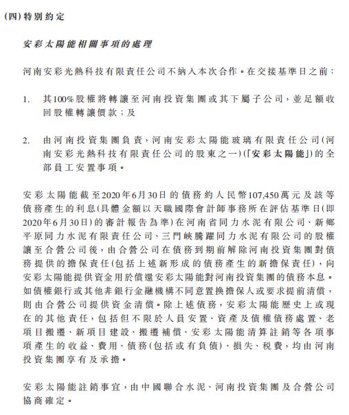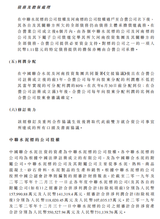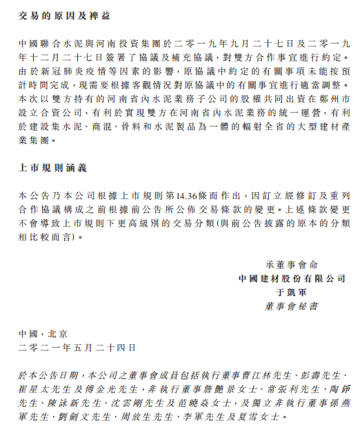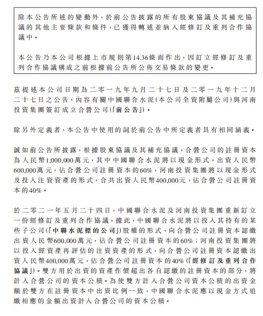 中国联合水泥与河南投资集团于2019年9月27日及2019年12月27日签署了协议及补充协议,对双方合作事宜进行约定。由于新冠肺炎疫情等因素的影响,原协议中约定的有关事项未能按预计时间完成,现需要根据客观情况对原协议中的有关事宜进行适当调整。本次以双方持有的河南省内水泥业务子公司的股权共同出资在郑州市设立合资公司,有利于实现双方在河南省内水泥业务的统一运营,有利于建设集水泥、商混、骨料和水泥制品为一体的辐射全省的大型建材产业集团。