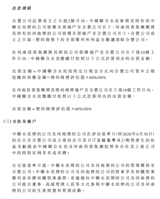 合营公司注册成立之日起2个月内,中国联合水泥会将其持有的中联水泥标的公司股权全部过户至合营公司名下,河南投资集团应将其持有的河南标的公司股权全部过户至合营公司名下。合营公司成立之日起,标的商标下的全部权利和利益自动让渡给合营公司。