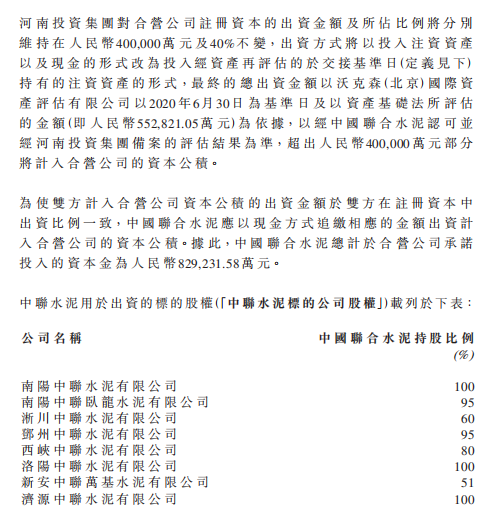 为使双方计入合营公司资本公积的出资金额于双方在注册资本中出资比例一致,中国联合水泥应以现金方式追缴相应的金额出资计入合营公司的资本公积。据此,中国联合水泥总计于合营公司承诺投入的资本金为人民币829,231.58万元。