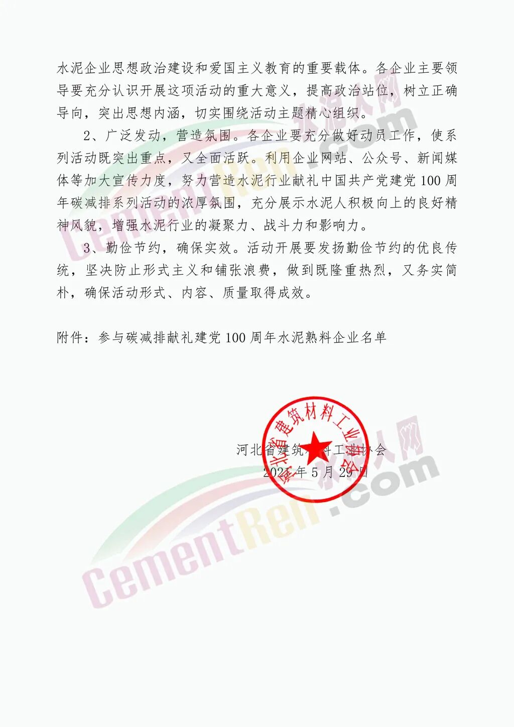 日前,河北省建筑材料工业协会发布《关于全省水泥熟料企业开展献礼中国共产党建党100周年碳减排系列活动的通知》给全省水泥熟料企业称,依据相关文件要求,结合全省水泥熟料企业实际,经研究决定在七一前夕组织全省水泥熟料企业开展献礼中国共产党建党100周年碳减排活动。