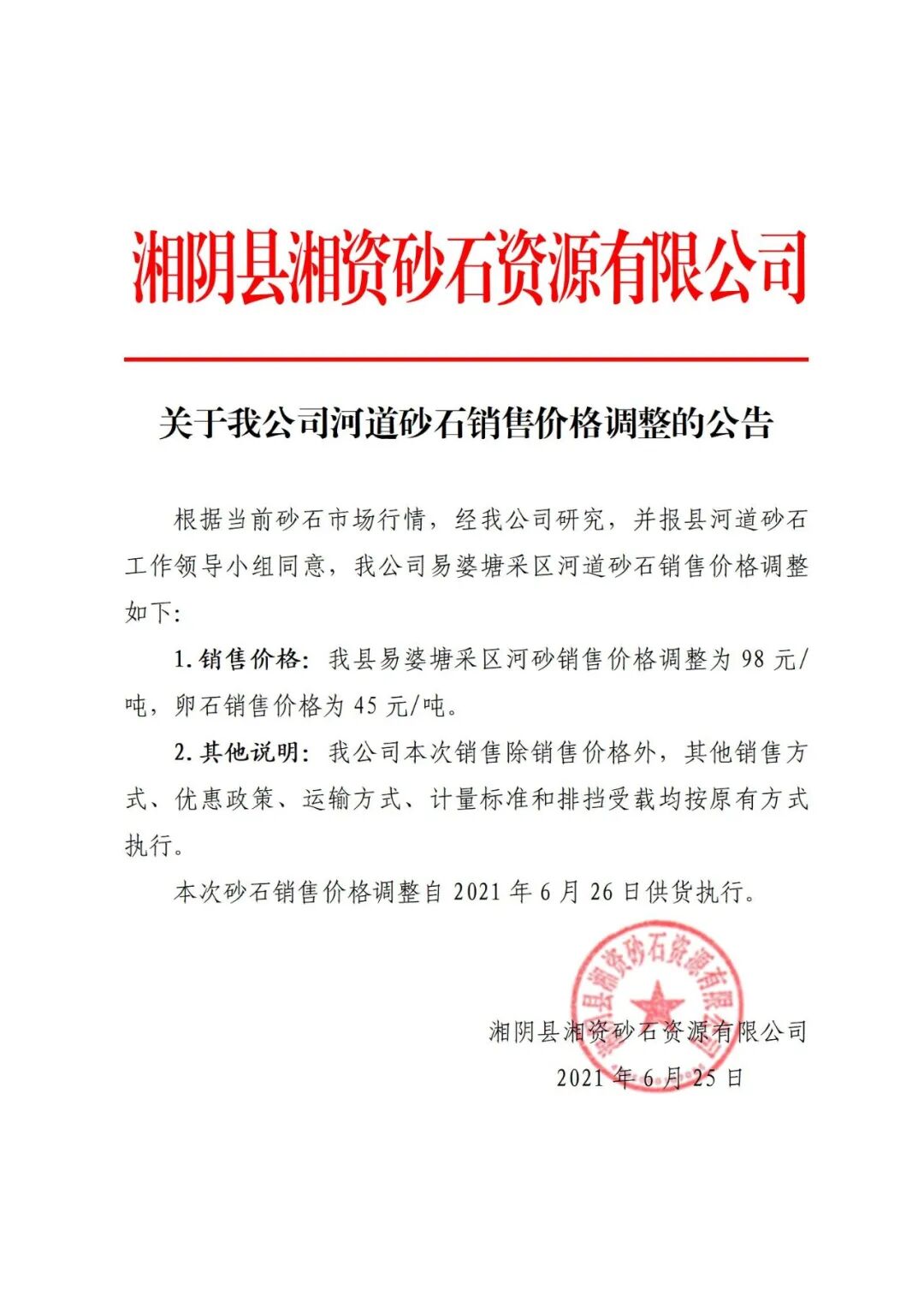 湘资砂石发布最新公告:易婆塘采区河砂98元/吨,卵石45元/吨 发布日期:2021-06-28 06:27:49 点击量:1 标签:行业新闻 文 字:雷闪闪 图 片:欧阳琼 责任编辑:李欣桐声明:对转载、观点、图频保持中立,目的仅在于传递信息,版权归原作者,如遇侵权,我们将及时删除,谢谢。