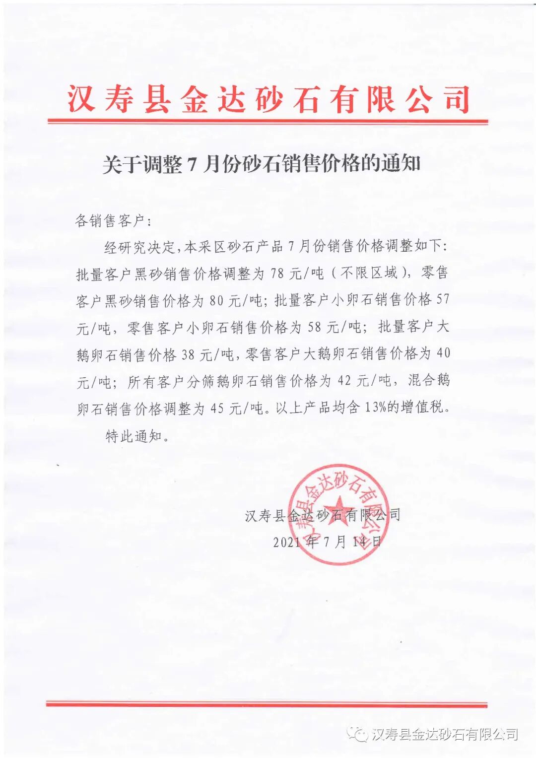 汉寿县金达砂石发布调价通知,较上月整体下降7元/吨 发布日期:2021-07-16 01:40:19 点击量:1 标签:行业新闻 据了解,汉寿县金达砂石此前发布价格通知,6月22日起运往岳阳方向经百盛锚地过驳销往江浙市场的黑砂销售价格调整为85元/吨(单砂客户价格调整为87元/吨)。文 字:雷闪闪 图 片:欧阳琼 责任编辑:李欣桐声明:对转载、观点、图频保持中立,目的仅在于传递信息,版权归原作者,如遇侵权,我们将及时删除,谢谢。