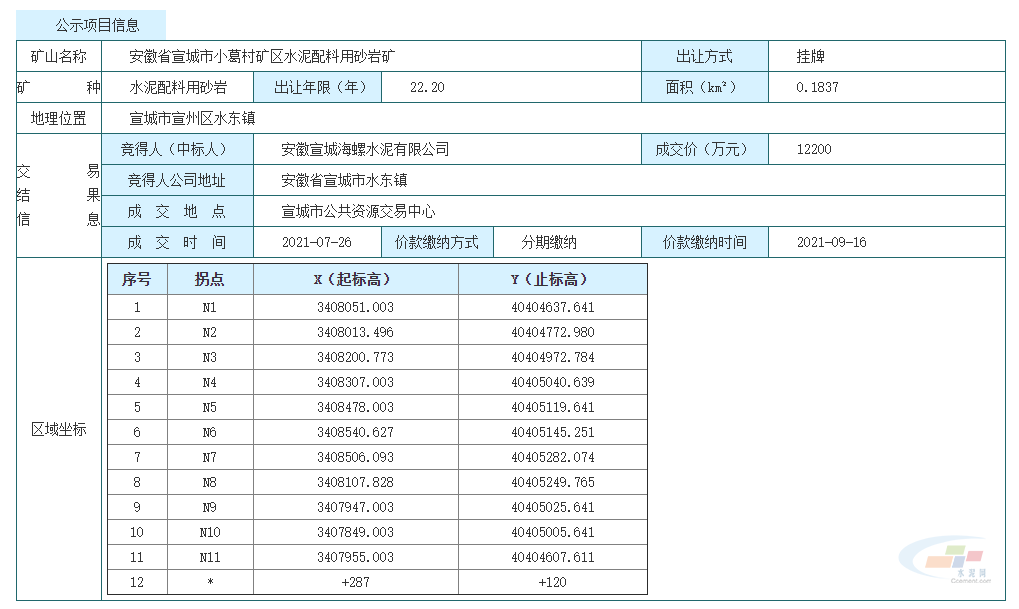 成交价1.22亿元!海螺水泥拿下安徽一矿山采矿权 发布日期:2021-08-09 08:40:01 点击量:1 标签:行业新闻 近日,从自然资源部发布的安徽省宣城市小葛村矿区水泥配料用砂岩矿的招拍挂出让公示得知,安徽宣城海螺水泥以12200万元的价格竞得该矿区水泥配料用砂岩矿采矿权。宣自然资规公示〔2021〕2号根据国土资源部关于印发《矿业权交易规则》的通知(国土资规 [2017] 7号)有关规定,现将安徽省宣城市小葛村矿区水泥配料用砂岩矿采矿权招拍挂出让有关事项公示如下:一、本次招拍挂出让的采矿权基本情况项目名称:安徽省宣城市小葛村矿区水泥配料用砂岩矿项目地理位置:宣城市宣州区水东镇面积:0.1837 平方公里开采主矿种:水泥配料用砂岩二、公示时间2021年8月3日 至 2021年8月13日 止(10个工作日)对本采矿权招拍挂出让公示内容有异议的,请在公示期限内以书面材料形式送达宣城市自然资源和规划局。宣城市自然资源和规划局二〇二一年八月三日出让信息来源:宣城市自然资源和规划局文 字:雷闪闪 图 片:欧阳琼 责任编辑:李欣桐声明:对转载、观点、图频保持中立,目的仅在于传递信息,版权归原作者,如遇侵权,我们将及时删除,谢谢。