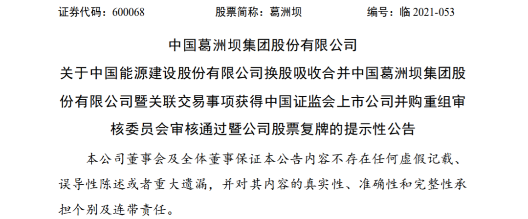 8月11日,中国能源建设股份有限公司(以下简称中国能建)换股吸收合并中国葛洲坝集团股份有限公司暨关联交易(以下简称本次重组)获得中国证监会并购重组审核委员会无条件通过。交易完成后,中国能建将实现在A+H两地上市。