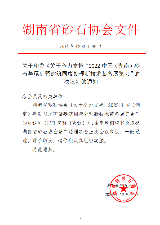 关于印发《关于全力支持“2022中国(湖南)砂石与尾矿暨建筑固废处理新技术装备展览会”的决议》的通知