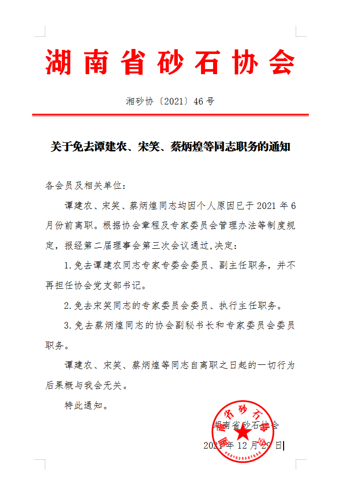 关于免去谭建农、宋笑、蔡炳煌等同志职务的通知 发布日期:2021-12-30 08:09:51 点击量:1 标签:通知公告 文 字:雷闪闪 图 片:欧阳琼 责任编辑:李欣桐声明:对转载、观点、图频保持中立,目的仅在于传递信息,版权归原作者,如遇侵权,我们将及时删除,谢谢。