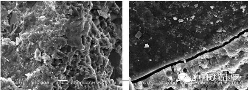 张裕民等人做过机制砂与天然砂的电镜分析,观察发现石灰石质人工砂与水泥水化凝胶间结合紧密,界面处无裂缝 。而天然砂与水泥水化界面多有裂缝,16 张照片中,有14 张界面有裂缝。有的宽度达1~2μm。