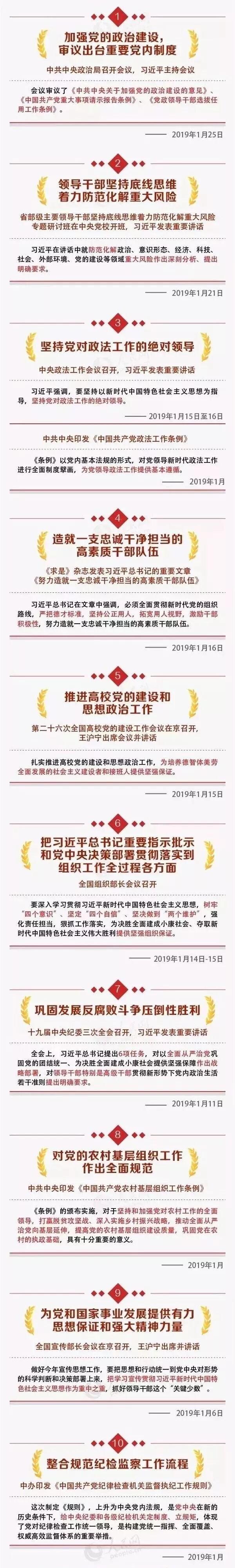 今年,中央加强党建有一系列大动作 发布日期:2019-02-20 07:28:18 点击量:1 标签:党建活动 2019年是新中国成立70周年,是全面建成小康社会的关键之年。十九届中央纪委三次全会召开、全国组织部长会议召开、全国宣传部长会议召开、《中国共产党农村基层组织工作条例》出台……中央加强党建有一系列大动作!★中央加强党建★大动作盘点 (原载:中国共产党新闻网)文字编辑/聂云川图文校对/欧阳琼责任编辑/李欣桐